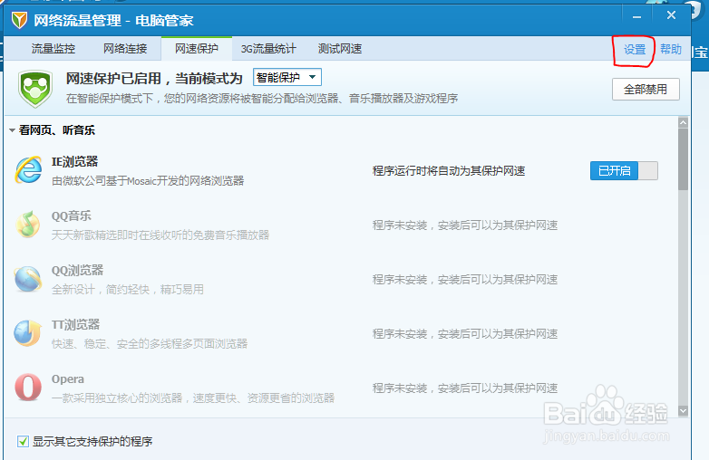 點(diǎn)擊“網(wǎng)速保護(hù)“界面右上角的”設(shè)置“按鈕。(如圖所示)