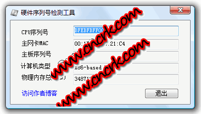 硬件序列號檢測工具可檢測CPU序列號,網(wǎng)卡mac,主板序列號,計算機類型,物理內(nèi)存總量。