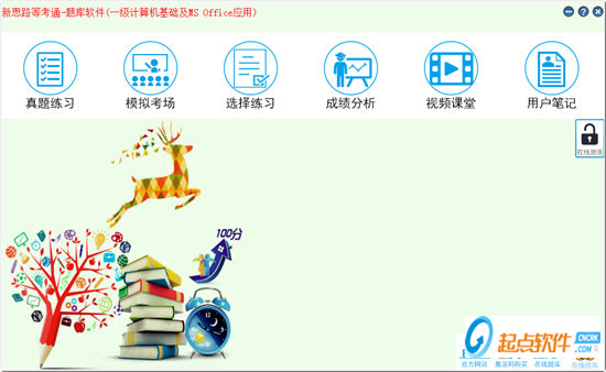 新思路等考通一級ms軟件提供了開放式的考試環(huán)境,具有自動計(jì)時(shí)、斷點(diǎn)保護(hù)、自動閱卷和回收等功能??荚囅到y(tǒng)僅在計(jì)算機(jī)上進(jìn)行考試,考生只須進(jìn)行一次考試,就可獲得知識和能力水平的評價(jià),考試成績劃分為優(yōu)秀、良好、及格和不及格四個(gè)等級成績,考試及格者由教育部考試中心頒發(fā)統(tǒng)一印制的合格證書。新思路等考通一級ms軟件在中文版Windows 7系統(tǒng)環(huán)境下運(yùn)行,用來測試考生在Windows的環(huán)境下進(jìn)行系統(tǒng)操作、字處理、電子表格、演示文稿、選擇題(計(jì)算機(jī)基礎(chǔ)知識和微型計(jì)算機(jī)系統(tǒng)的組成)以及上網(wǎng)操作的技能和水平。