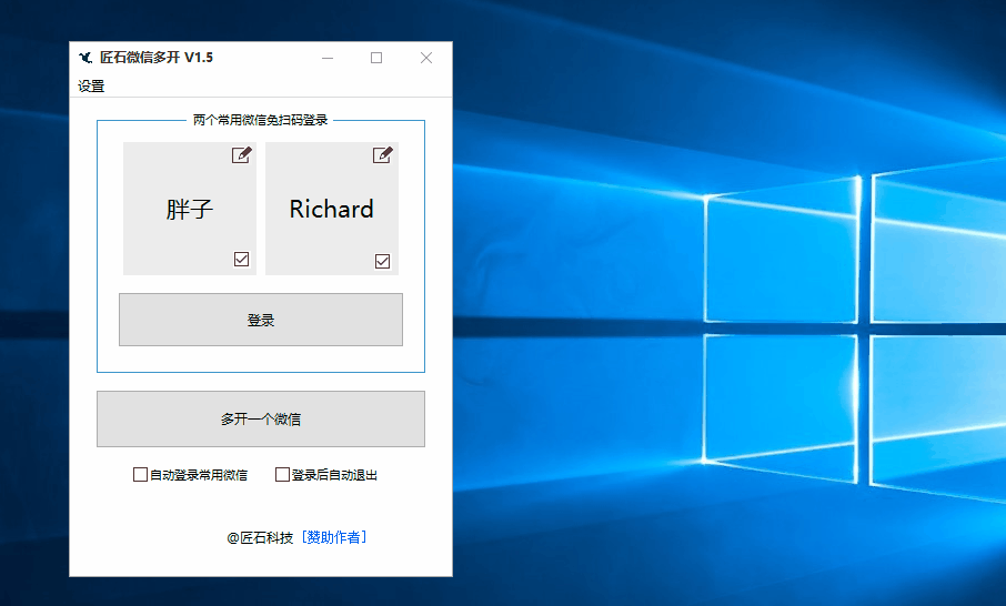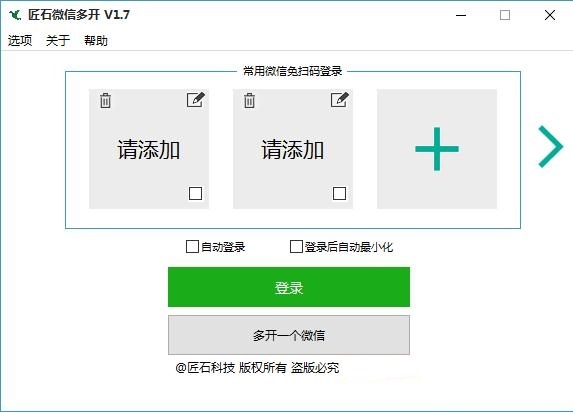 匠石微信多開(免掃碼登錄)是一款非常實(shí)用的聊天通訊軟件,微信免掃碼登錄|無限多開|保存微信登錄配置,重要的是可以保存微信登錄配置,讓用戶一鍵登錄,如果有感興趣的歡迎前來下載免費(fèi)使用!【功能介紹】