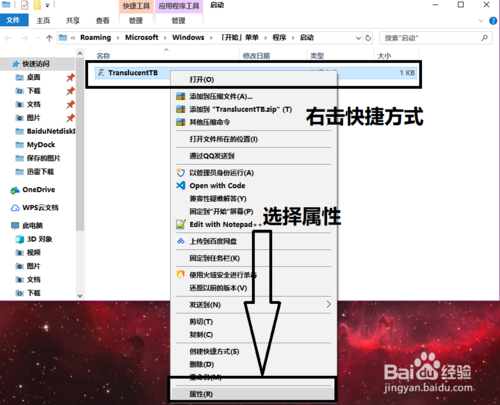 在C:\Users\用戶名\AppData\Roaming\Microsoft\Windows\Start Menu\Programs\Startup文件夾目錄下右擊TranslucentTB快捷方式,選擇屬性