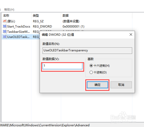 接下來,我們確定將新建立的DWORD(32位)值命名為“UseOLEDTaskbarTransparency”,我們可以對(duì)新建立的鍵值擊右鍵進(jìn)行修改。