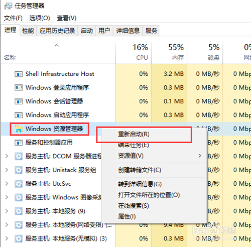 在Win10系統(tǒng)的任務(wù)管理器頁面中,找到“Windows資源管理器”選項(xiàng),對(duì)著該程序擊右鍵,使其重新啟動(dòng)即可。