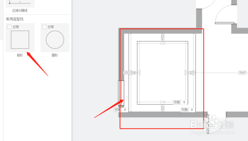 進(jìn)入自定義頂面界面,我們選擇矩形,按客廳位置框出吊頂位置,一定記得個窗簾盒留200的距離,然后在中間再框選一次,如圖制作