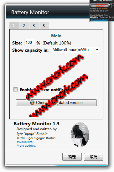 battery monitor是一個windows 7/vista的桌面小工具,可以顯示當(dāng)前剩余電量和電池使用狀態(tài),適用于筆記本用戶。