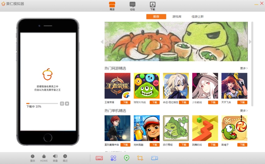 果仁模擬器是一款可以模擬iphone的軟件,與市面上大多數(shù)模擬器不同,市面上大多知名的模擬器都是安卓模擬器,雖然功能大致相同,但是對于沒有蘋果的玩家來說,無法與IOS系統(tǒng)的玩家一起游戲,始終是一種遺憾。要知道蘋果的系統(tǒng)是封閉式的,而許多玩家面對蘋果系統(tǒng)的獨攬大作望塵莫及。甚至你無法與IOS玩家一起來上一盤王者榮耀。所以果仁懷揣著一種讓電腦玩IOS游戲的使命誕生了。果仁模擬器是一款可以完美支持IOS手機(jī)系統(tǒng)的模擬器,它可以輕松的實現(xiàn)安裝、使用、卸載相關(guān)應(yīng)用軟件,讓用戶體驗操作IOS手機(jī)系統(tǒng),簡單的來說,果仁模擬器就像一臺電腦上運行的iphone。【果仁模擬器軟件特點】