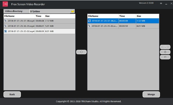 錄制完成后,單擊“后退”按鈕,選擇錄制的視頻剪輯,然后單擊“+”按鈕移動(dòng)右列表。單擊“合并”將多個(gè)文件合并為一個(gè)文件。