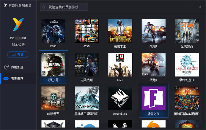 2、選擇你要加速的游戲,使用快速查找更方便添加游戲。