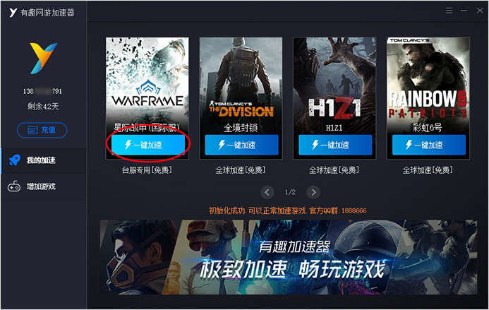 4、點(diǎn)擊 “一鍵加速” 就可以急速暢玩游戲了。