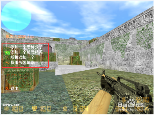 在彈出的機(jī)器人添加菜單中,按數(shù)字1添加一個(gè)恐怖分子,按數(shù)字2添加一個(gè)反恐精英,按數(shù)字3為隨機(jī)添加,按數(shù)4添加滿(mǎn)服務(wù)器,如需要多個(gè)重復(fù)操作