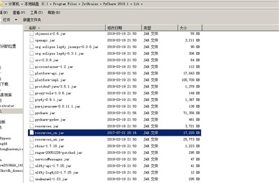 7、然后進入漢化包文件夾,復制resources_cn.jar進入到C:Program FilesJetBrainsPyCharm 2019.1lib位置,將漢化包粘貼進去,然后將所在位置的resources_en.jar重命名或者刪除