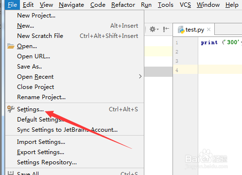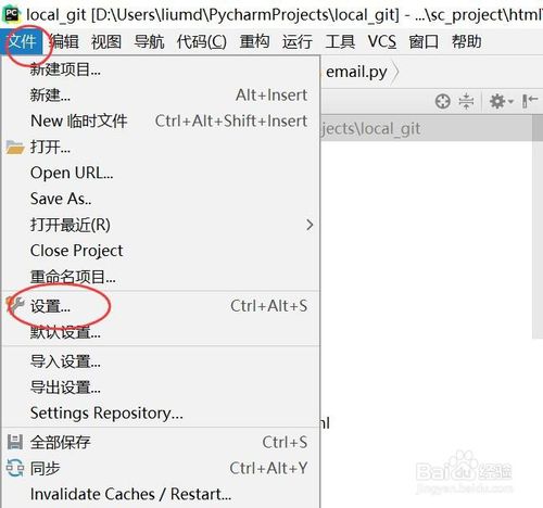 進行點擊了file的菜單中,彈出了下拉菜單選中為 settings 的選項。