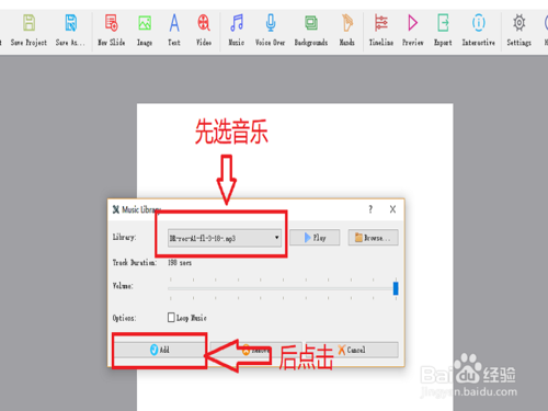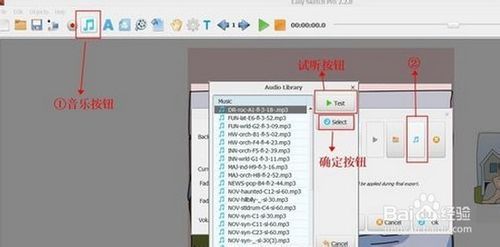 點(diǎn)擊音樂(lè)按鈕,選擇音樂(lè),在選擇音樂(lè)的過(guò)程中科院先試聽(tīng),滿意后按確定,確定選擇的音樂(lè)之后,在點(diǎn)擊右下角的”ok“.