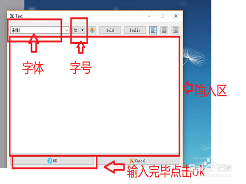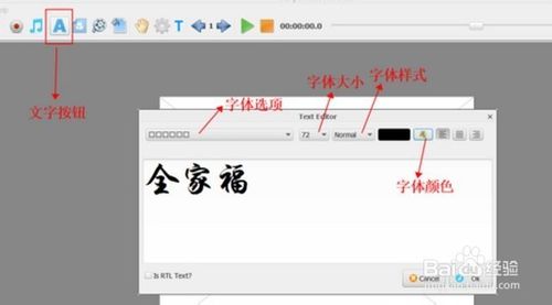 點(diǎn)擊文字按鈕添加文字。文字可調(diào)整大小,文字樣式以及顏色等。編輯好文字按”ok“確認(rèn)。確認(rèn)之后,調(diào)整文字位置,滿意之后鼠標(biāo)右擊”K“進(jìn)行固定。如圖