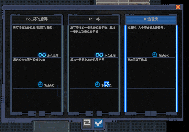 2、系統(tǒng)插件在難度1中首次出現(xiàn),在特定關(guān)卡中會(huì)跳出插件選擇框,玩家可以選擇其中的任意一個(gè)、兩個(gè)或全部,也可以什么都不選。每個(gè)系統(tǒng)插件有好有壞,所以玩家不能貪心,要懂得取舍。