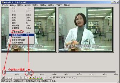首先,在VirtualDub中打開一個需要分割的AVI視頻文件,然后選擇“編輯”菜單下的“設置選擇起點”,也就是在這里選擇需要分割視頻的開始點,再在“編輯”菜單中選擇“設置選擇終點”,同時在下面的視頻幀數(shù)條上選擇好對應的位置。這樣分割的起始點也就設置完畢了。設置分割視頻的起始點