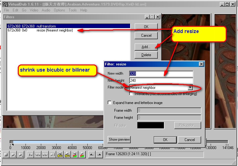在彈出的對話框里填希望的大小,filter mode一般用bilinear 或 bicubic(適合尺寸減小,別想著去加大尺寸,不是軟件不行,是沒有意義)。尺寸限制根據(jù)codec不同而異,一般是4獲16的倍數(shù),大家自己查,軟件有提示。