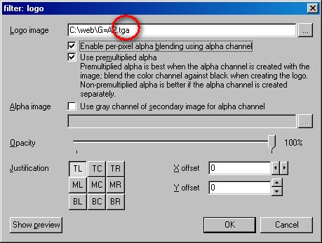 filter->logo,virtualDub支持4種格式,tga,bmp,jpg,jpeg。后三種就是直接加個圖進去, 產(chǎn)生一個四方框;很多時候你是想一個浮在上面的標志,如同背景透明的GIF,那必須要使用alpha channel,文件格式為.tga,做法如下(基于PSP7.01):