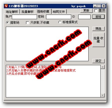 最近115網(wǎng)盤上視頻資源被封鎖了,好多給力視頻都無法下載,于是popok自己編寫了一個115網(wǎng)盤地址解析工具。即使115下載頁面中沒有可用的下載地址,你也可以使用它來提取出直接下載地址,用于迅雷等下載軟件高速下載,當(dāng)然不僅是視頻資源,只要是115網(wǎng)盤資源都可以解析
