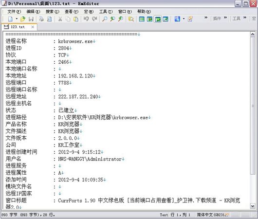 2、保存某進(jìn)程的詳細(xì)信息:CurrPorts支持將某進(jìn)程的信息保存成文本文檔,包括高進(jìn)程的ID、協(xié)議、端口詳情、本地地址、遠(yuǎn)程主機(jī)地址、狀態(tài)、版本、當(dāng)前運(yùn)行的程序等等詳情,列舉的非常詳情,你想知道的項(xiàng)目一目了然。