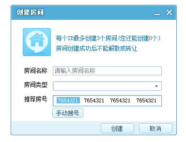 點(diǎn)擊主面板上的創(chuàng)建房間按鈕,按要求填入指定資料即可申請(qǐng)到一個(gè)7位號(hào)碼的房間,請(qǐng)注意創(chuàng)建房間成功后的回收規(guī)則