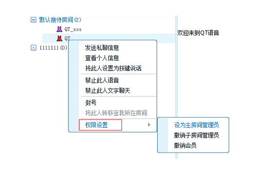 在房間面板的成員列表區(qū)域選中某個(gè)用戶后,可通過(guò)鼠標(biāo)右鍵中的【權(quán)限管理】來(lái)對(duì)此用戶進(jìn)行相關(guān)權(quán)限管理。