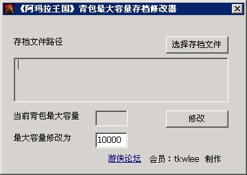 阿瑪拉王國:懲罰背包最大容量修改器 找到存檔文件路徑后修改最大容量為自己設(shè)定的數(shù)值即可! 工具會自動備份存檔,添加.bak后綴,如果修改之后后悔了,把.bak去掉即可。