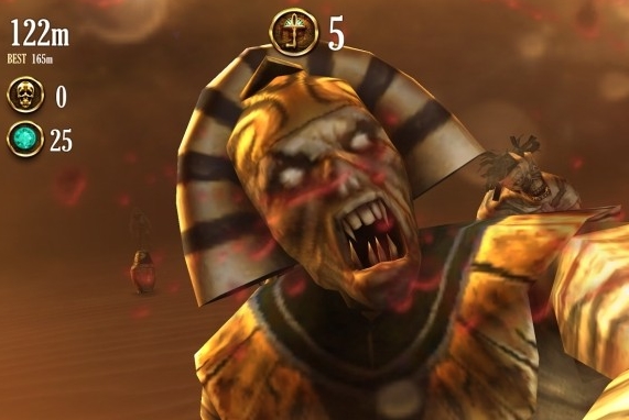 當(dāng)下《Temple Run》余溫未散,而騰訊的《天天酷跑》又如火如荼地宣布月入破億,這樣的跑酷市場必定讓許多想著手這類游戲的團隊強咽一口老血望。而由TriggerHappy團隊在IOS平臺上發(fā)布的《Escape from Doom》打破了現(xiàn)有慣例,以全新的視角展現(xiàn)了一款別具風(fēng)格的FPS跑酷作品。逃出死人堆是一款和Into The Dead《活死人黎明》同樣有著暗黑風(fēng)的游戲。游戲風(fēng)格迎合重口味玩家的喜好。游戲的背景跟木乃伊系列電影一樣,玩家將現(xiàn)身在一片荒涼的古埃及中,面對周圍種類各異的法老守護者的活死人包圍,你需要做的就是拿著一支槍沖出重圍。