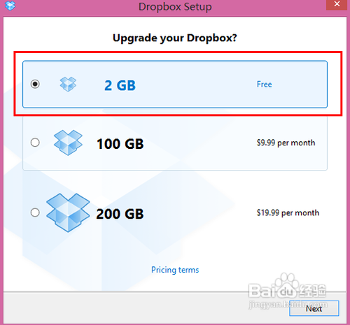 接下來,軟件會(huì)讓我們選擇使用的容量。默認(rèn)的是 2G 的免費(fèi)空間,另外還有二個(gè) 100G 和 200G 的分別是每月 9.99美元和 19.9美元。如下圖所示