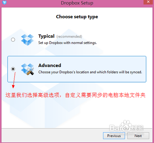選擇了空間以后,接下來選擇 Dropbox 在本地電腦端同步的文件夾,這里我們選擇“Advanced”,如下圖所示