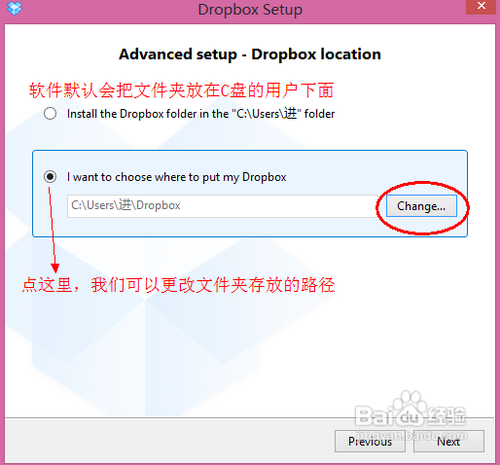 這里有二個(gè)選項(xiàng),一個(gè)是軟件默認(rèn)的安裝同步文件夾的位置,是在 C 盤下用戶目錄中。另一個(gè)是我們可以自定義的路徑,如其它盤 D、E、盤都可以。我們點(diǎn)擊“Change”,如下圖所示