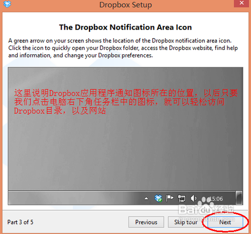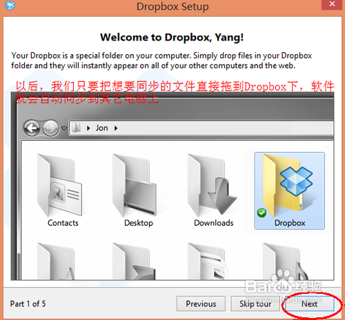 Dropbox 的程序通知圖標(biāo)會(huì)出現(xiàn)在系統(tǒng)右下角的任務(wù)欄中,雙擊這個(gè)圖標(biāo)就會(huì)直接打開 Dropbox 在電腦本地的目錄。點(diǎn)擊“Next”,繼續(xù),如下圖所示