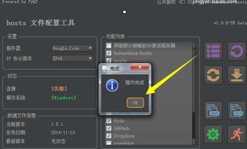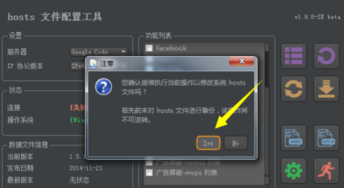 在彈出的“注意”窗口中,確認(rèn)已對(duì)Hosts文件進(jìn)行了備份操作,此時(shí)點(diǎn)擊“YES”按鈕進(jìn)行更改Hosts文件操作。操作成功后會(huì)有“操作成功”的提示。