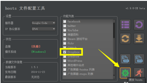 接下來從“功能列表”中勾選“DropBox”項(xiàng),點(diǎn)擊“更改Hosts”按鈕。