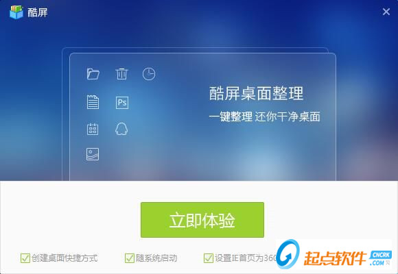 安裝完成!酷屏的安裝向?qū)?huì)提示安裝完成。這里有三個(gè)勾選項(xiàng),分別是創(chuàng)建桌面快捷方式、開(kāi)機(jī)啟動(dòng)和設(shè)置360導(dǎo)航為瀏覽器主頁(yè),如果不需要某項(xiàng)功能,取消勾選即可,點(diǎn)擊[立即體驗(yàn)]就可以馬上試用酷屏整理桌面了。