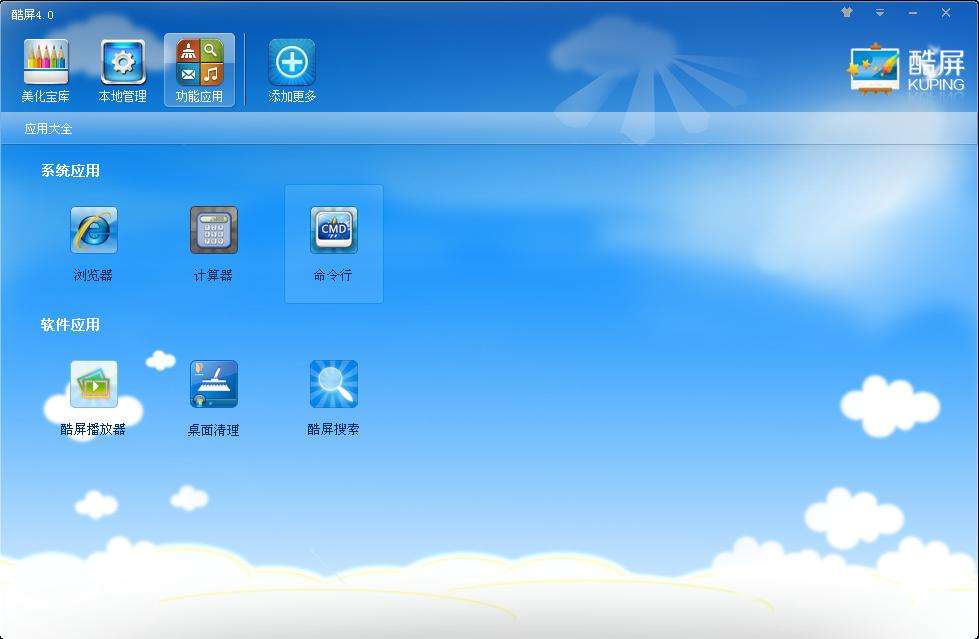 酷屏提供:CMD查詢、計(jì)算機(jī)、視頻播放器、圖片播放器、瀏覽器、桌面清理、桌面事件等精美桌面應(yīng)用,您可以將您經(jīng)常使用的工具添加到酷屏導(dǎo)航欄,解除您的后顧之憂