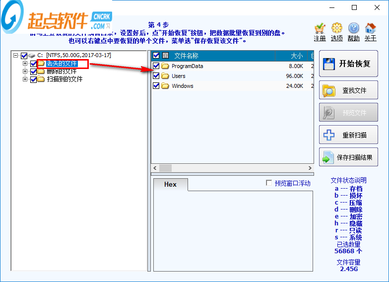 6、勾選要恢復(fù)的目錄或者文件,然后點擊【開始恢復(fù)】按鈕,等待恢復(fù)完成,其還提供了查找文件、預(yù)覽文件、重新掃描等功能。