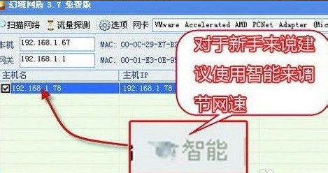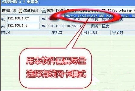 在主界面的“網(wǎng)卡”中,選擇接入局域網(wǎng)所用的網(wǎng)卡。如果同時(shí)可以使用無線連接和有線連接,那么建議在“網(wǎng)卡”中選擇有線網(wǎng)卡,而不要使用無線網(wǎng)卡,這點(diǎn)請(qǐng)大家記住了。因?yàn)橐暵酚善鞑煌?,幻境網(wǎng)盾使用無線網(wǎng)卡可能根本無法控制別人的網(wǎng)速。