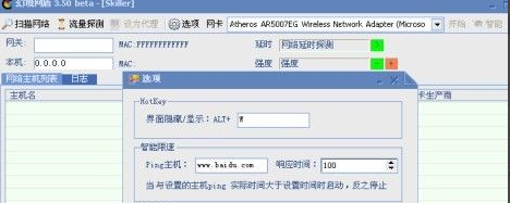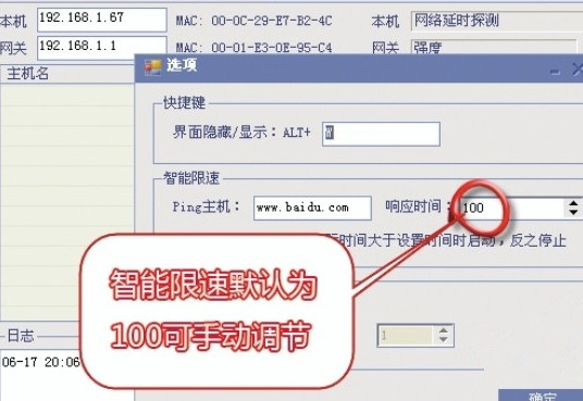 使用之前,第一次運(yùn)行幻境網(wǎng)盾會(huì)彈出一個(gè)“選項(xiàng)”設(shè)置窗口,這里可以設(shè)置界面隱藏快捷鍵、智能限速的設(shè)置、ARP防火墻等。智能限速的默認(rèn)響應(yīng)時(shí)間是100ms,對(duì)于懶人或者小菜鳥來說,直接使用默認(rèn)值就可以了。