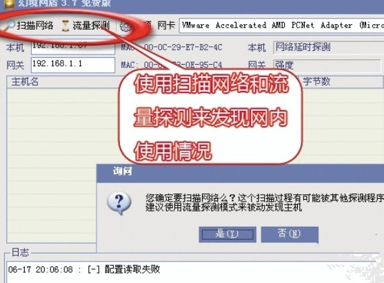 4.點(diǎn)擊“掃描網(wǎng)絡(luò)”或者“流量探測(cè)”來實(shí)現(xiàn)檢測(cè)局域網(wǎng)中的電腦。為了保密起見,建議選擇“流量探測(cè)”。如果“流量探測(cè)”找不到要控制的電腦,在檢查網(wǎng)關(guān)的IP地址沒有錯(cuò)誤之后,才使用“掃描網(wǎng)絡(luò)”功能。也可以在主機(jī)列表上點(diǎn)擊右鍵選擇“添加主機(jī)”手動(dòng)添加要控制的電腦。