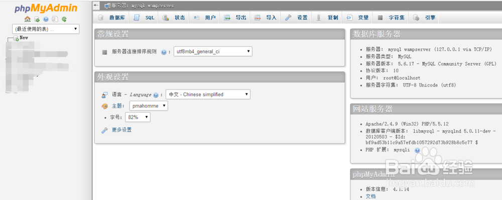 1、首先登陸phpmyadmin,有兩種方法,第一鐘是直接點擊wampserver圖標(biāo),再點擊phpmyadmin即可登陸進來是最常用的方法;其次是在瀏覽器地址中輸入http://localhost:8080/phpmyadmin(注意8080是端口號,默認的是80可不填,簡寫為http://localhost/phpmyadmin/,按enter鍵)