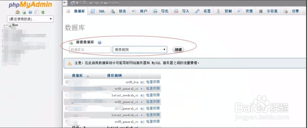 點擊New,頁面的左邊會彈出新建數(shù)據(jù)庫:填寫數(shù)據(jù)庫名(比如寫user),排序規(guī)則(utf8-general_ci)