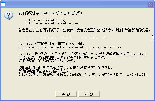 惡意軟件清理助手Combofix是一個批處理程序,由sUBs所撰寫。執(zhí)行后,它會掃描你的系統(tǒng),當發(fā)現(xiàn)系統(tǒng)中存在已知的惡意程序時,Combofix會自動嘗試清除系統(tǒng)中被植入或感染的文件。 除了可以刪除大量的惡意軟件外,Combofix也會顯示系統(tǒng)掃描報告,可以幫助有經(jīng)驗的人員分析、取得樣本,并刪除無法刪除的惡意文件。由于此工具能力較強,花費的時間也比較多。建議請勿自行隨意嘗試刪除惡意文件,由安全人員指導(dǎo)下使用,避免文件丟失以及影響電腦正常功能。警告:不建議無系統(tǒng)維護經(jīng)驗用戶使用。