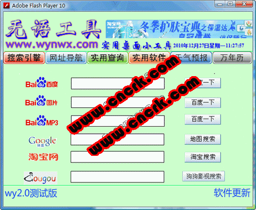 目前無(wú)語(yǔ)工具提供迷你版的搜索引擎入口、精簡(jiǎn)網(wǎng)址導(dǎo)航、天氣預(yù)報(bào)、萬(wàn)年歷、實(shí)用查詢(手機(jī)號(hào)碼歸屬地查詢、郵政編碼查詢、固定電話區(qū)號(hào)查詢、航班查詢、火車查詢、酒店查詢)、系統(tǒng)垃圾清理、系統(tǒng)關(guān)機(jī)、截圖軟件等實(shí)用工具組成。工具由adodb flash跟dos開(kāi)發(fā),無(wú)毒無(wú)插件。
