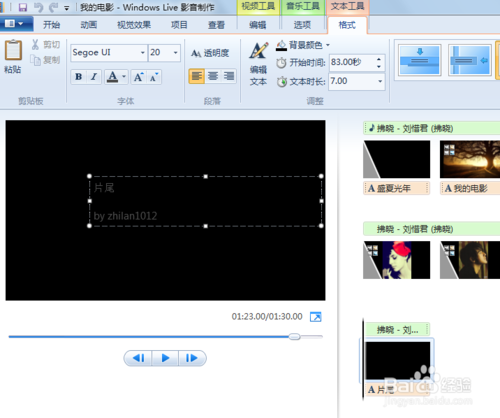 點擊片頭,片尾,設(shè)置相關(guān)文字及格式,如圖所示(如不更改,視頻顯示片頭為我的電影)