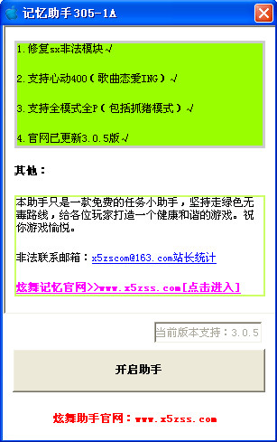 QQ炫舞記憶助手隨版本更新,是一款功能強(qiáng)大的QQ炫舞多功能輔助工具。不過軟件打開和關(guān)閉時(shí)均會(huì)有彈出窗口,請(qǐng)玩家使用時(shí)注意關(guān)閉。qq炫舞記憶助手免費(fèi)高分工具功能簡(jiǎn)單實(shí)用,不破壞游戲平衡。無廣告,無利潤(rùn),不做任何商業(yè)用途!已經(jīng)加入TGA檢測(cè)??梢酝昝肋B續(xù)perfect great good god。 qq炫舞記憶助手免費(fèi)高分最新版,更新頻率非常地快,3.2.2心動(dòng)版是最新的一個(gè)版本,如果你運(yùn)行這款qq炫舞記憶助手時(shí)有版本更新提示,那么就升級(jí)吧!免費(fèi)高分!炫舞記憶助手最新版支持炫舞全模式全p、長(zhǎng)期掛機(jī)刷轉(zhuǎn)轉(zhuǎn)樂。過日常任務(wù),心動(dòng)400,黑屏,自動(dòng)開始,快速返回等等。