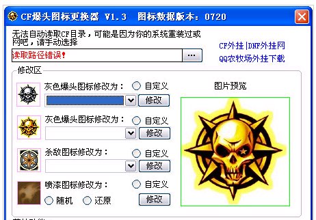 CF爆頭圖標(biāo)修改更換器,穿越火線 幫助CF玩家們修改爆頭圖標(biāo)的工具 選好游戲地址后就可以自定義爆頭圖標(biāo)了! CF爆頭圖標(biāo)修改器支持自定義圖片+無(wú)限6連殺聲音!