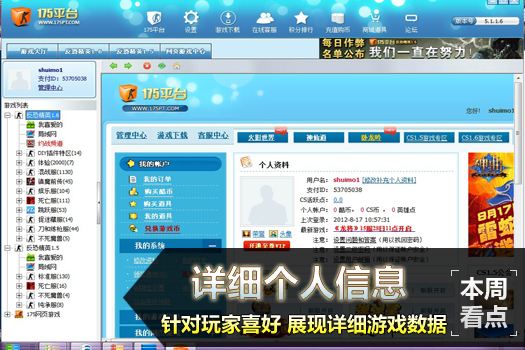 3.展現(xiàn)詳細(xì)個人信息;新平臺大廳醒目位置展現(xiàn)個人常用信息,針對玩家對游戲的喜好,展現(xiàn)了詳細(xì)的CS游戲數(shù)據(jù)。