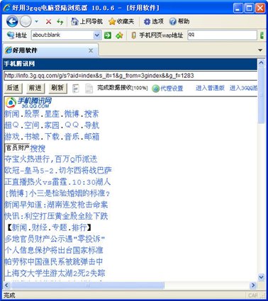 3gqq電腦登陸瀏覽器特點:打開網(wǎng)頁速度快,支持打開各種wap手機網(wǎng)站,玩各種手機網(wǎng)頁游戲,占用的硬盤空間極小,同時也減少瀏覽器對系統(tǒng)資源的占用率,操作簡單,界面美觀, 讓您更快速、輕松且安全地使用網(wǎng)絡(luò)。用電腦上WAP網(wǎng)頁,直接在電腦上瀏覽Internet觀看WAP網(wǎng)頁的內(nèi)容 ,玩游戲,樣樣齊全,3gqq電腦登陸瀏覽器已成為廣大網(wǎng)民使用瀏覽器的第一選擇。
