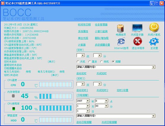 筆記本CPU溫度監(jiān)測工具BOCC是一款民間創(chuàng)意免費單文件監(jiān)測工具.監(jiān)測CPU溫度.硬盤溫度.CPU使用率.內(nèi)存使用率.超過設定上限會報警提示!CPU溫度.硬盤溫度報警也可以自動關機!有定時關機.重啟.待機.提醒功能.日程提醒功能!用戶可以設置報警延時.自動關機延時!可以在任務欄顯示監(jiān)測內(nèi)容!唯有不足的就是有些筆記本顯示不出CPU 溫度來!